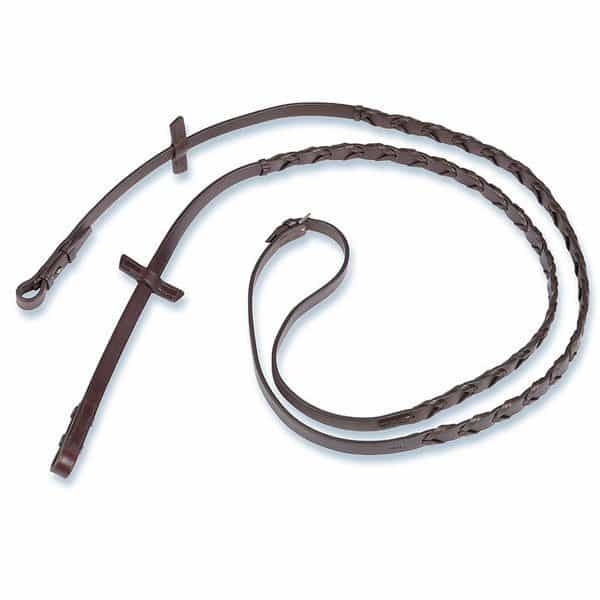 Flat, plaited, narrow leather reins with hook studs. These showy reins are nice to the touch and the plaiting offers an excellent grip.